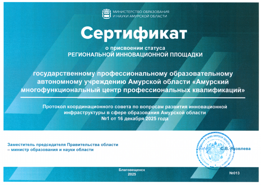 В декабре 2025 ГПОАУ АМФЦПК был присвоен статус региональной инновационной площадки.