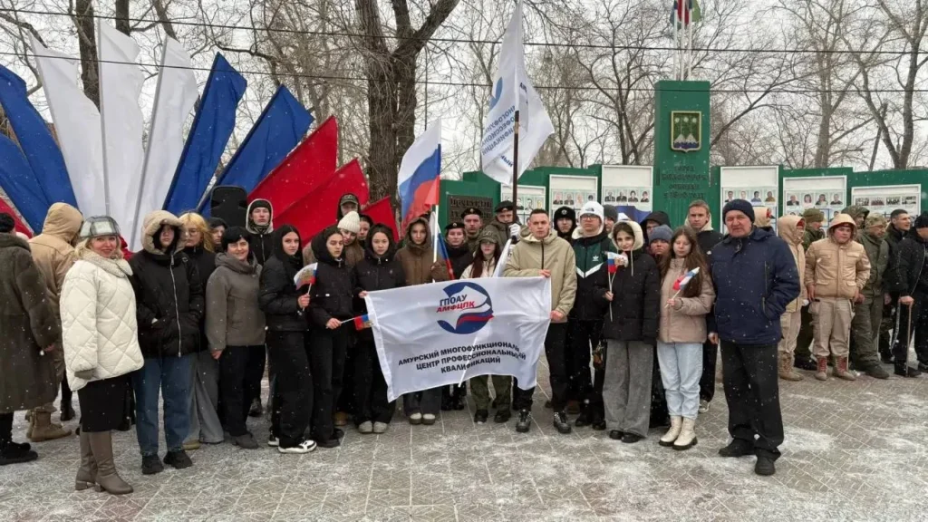 Наш город не стал исключением. У памятника «Вежливому солдату» прошёл митинг, в котором приняли участие студенты первого курса и курсанты военно-патриотического клуба «Амурские медведи» ГПОАУ АМФЦПК .