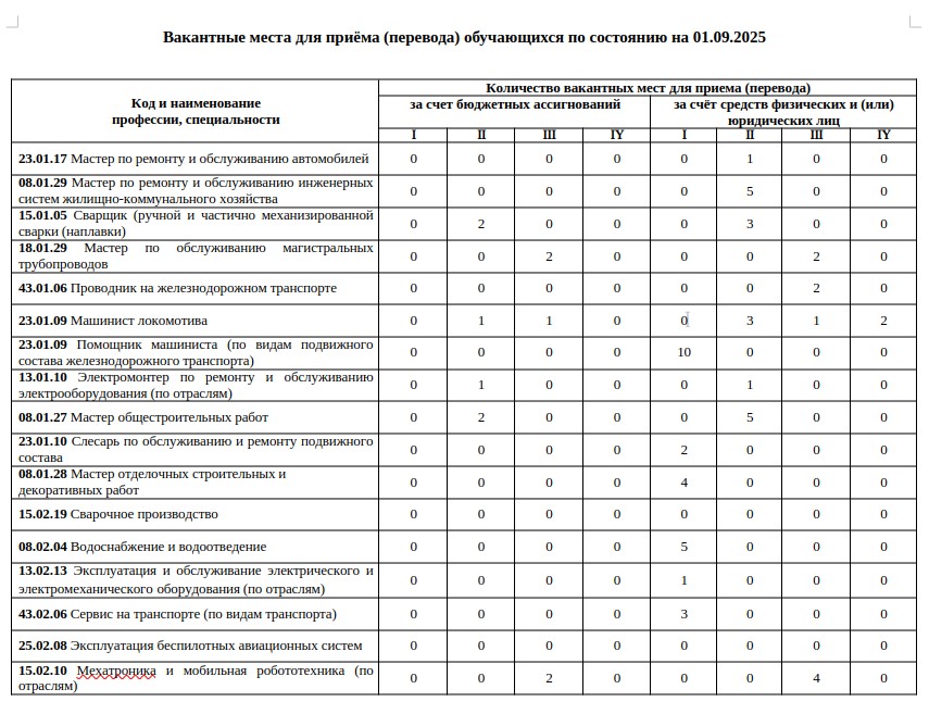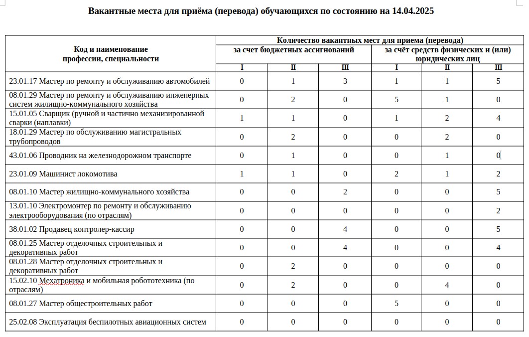 Вакантные места для приёма (перевода) обучающихся